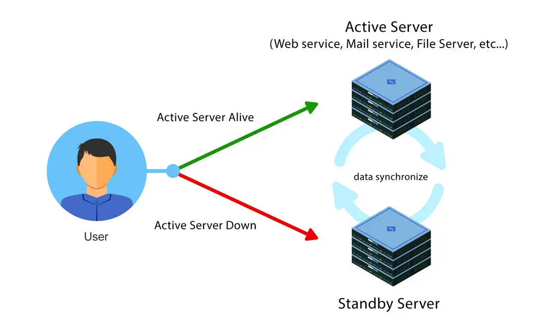 In case if there is problem with the Active Server, the Standby Server will immediately replace the Active Server and continue to run the services of the Active Server (e.g. email service, website service, file server, etc.), the process will only take seconds (depends on the actual situation).