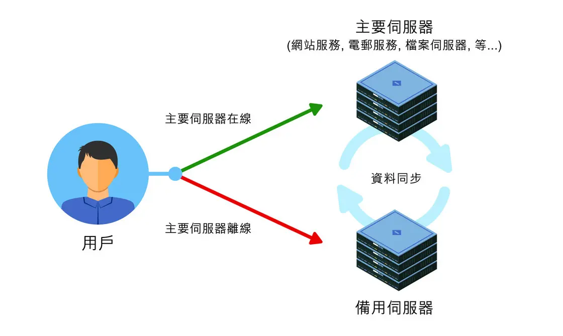 萬一主要伺服器不幸地發生問題,備用伺服器便會立即取代主要伺服器,並繼續執行主要伺服器的服務 (例如,電郵服務、網站服務、檔案伺服器等),過程只需十多秒 (須視乎實際情況而定)。